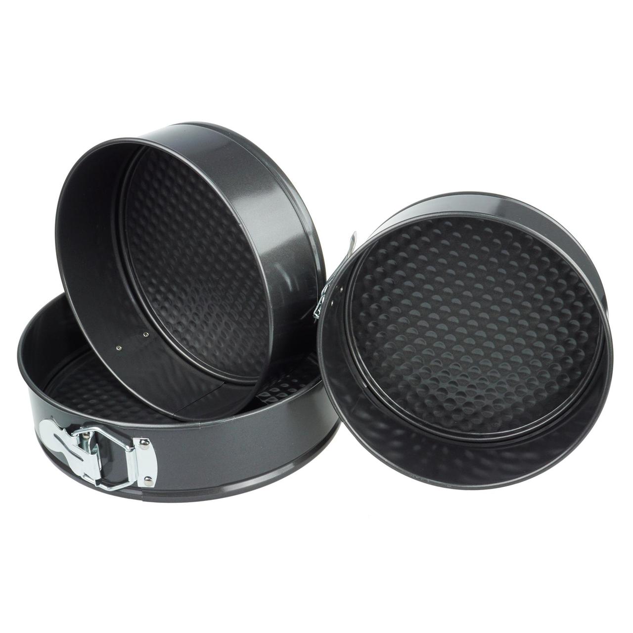 Антипригарні форми для випікання дають змогу одночасно готувати 3 коржі для торта, а у разі невикористання складаються одна в одну для компактного зберігання. Набір містить 3 форми для випікання діаметром 18, 20 і 22 см і заввишки стінок 6 см.